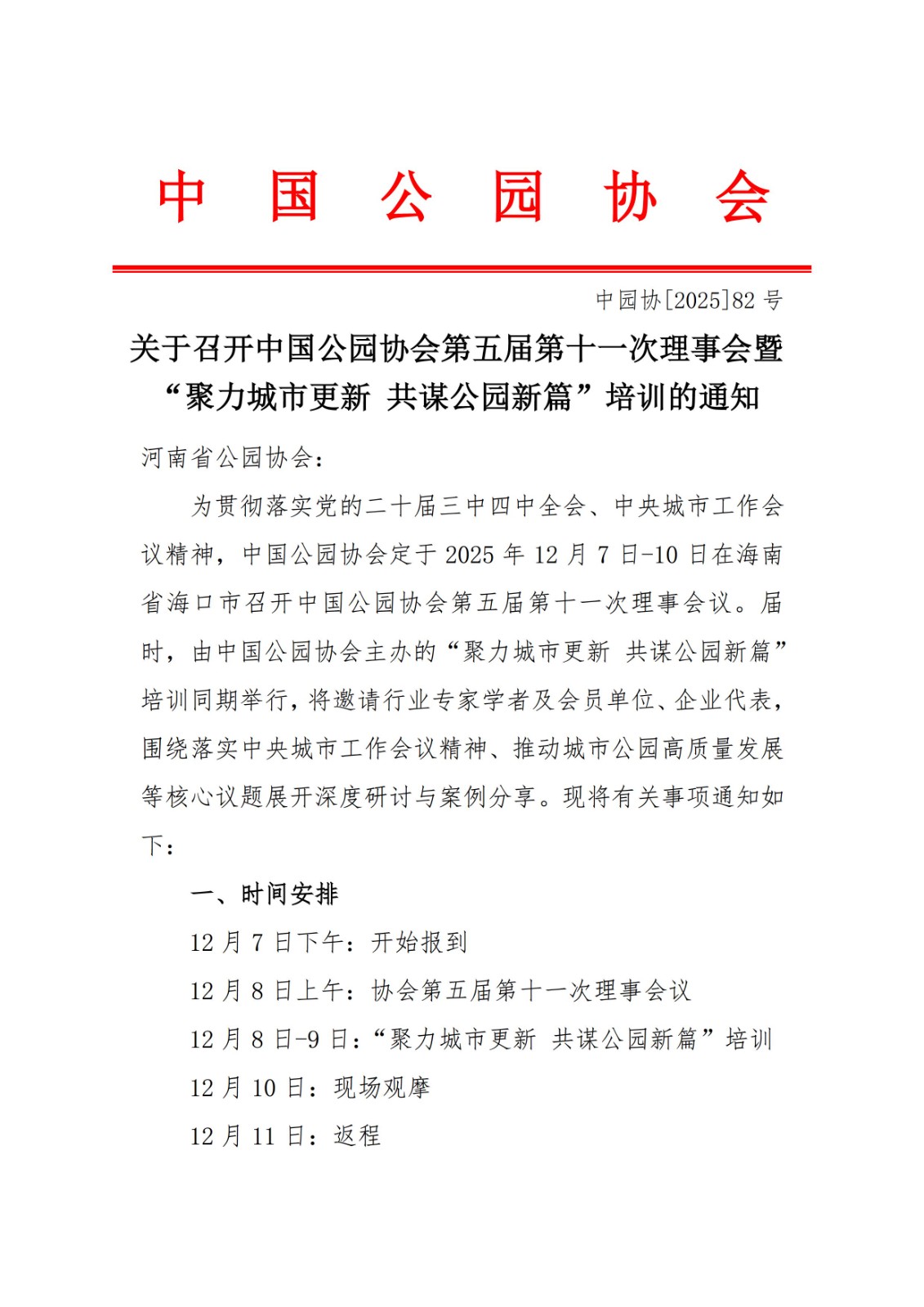 河南省公园协会转发 《关于召开中国公园协会第五届第十一次 理事会暨“聚力城市更新共谋公园新篇” 培训的通知》的通知